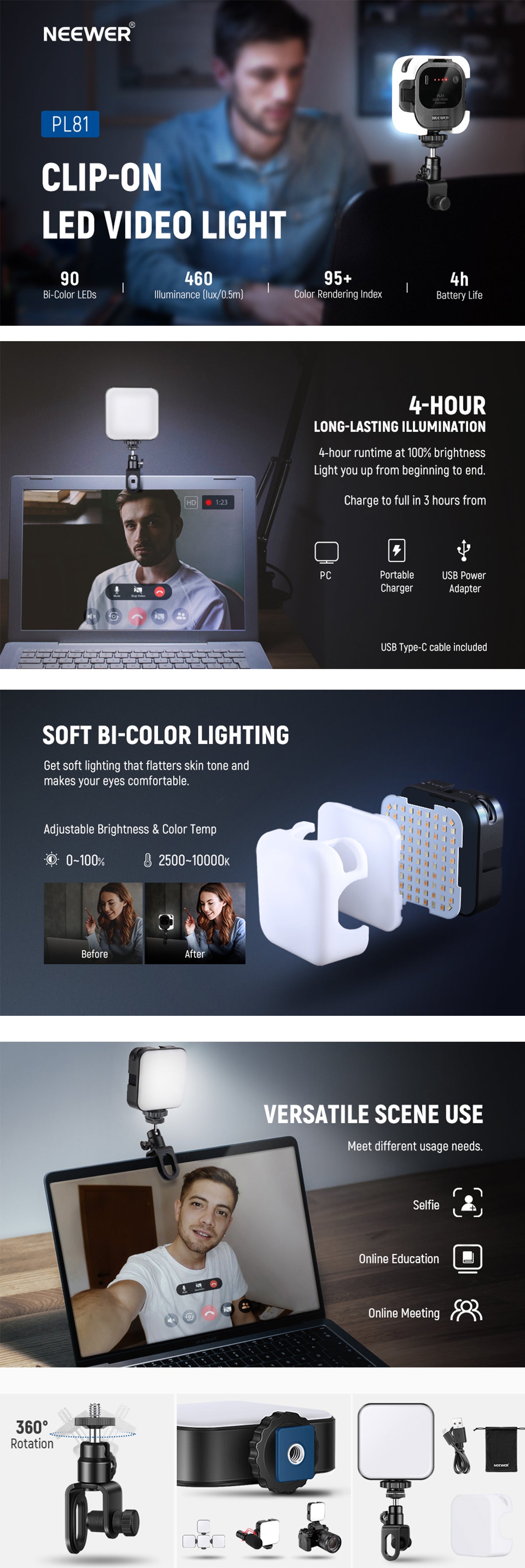 NEEWER PL81 Clip On LED Video Light Selfie Light for Phone Laptop Built-in Rechargeable Battery 2500K~10000K Bi